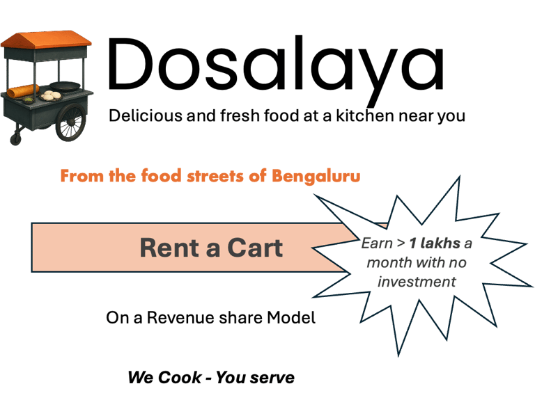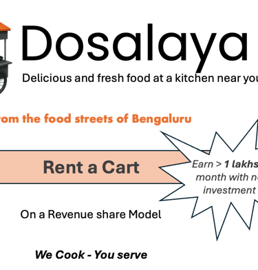 Dosalaya Kitchens can earn you upwards of ₹1 Lakhs per month. Call our team at +91 xxxxx xxxxx to signup.